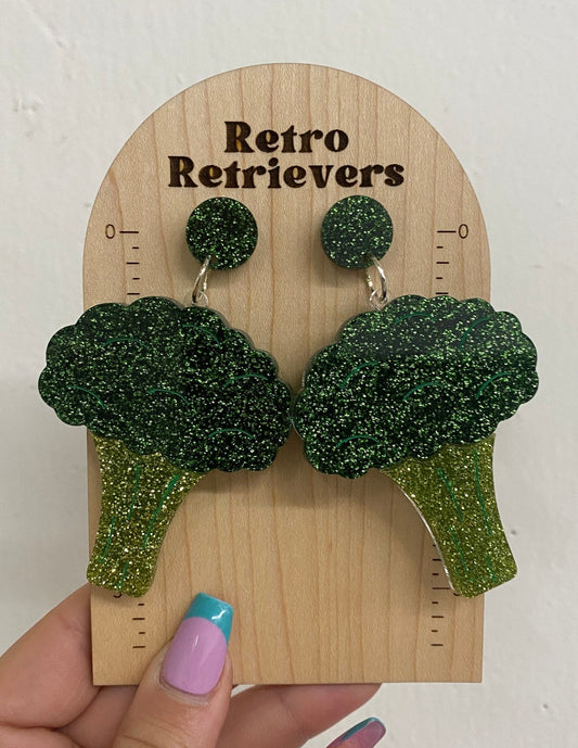 Broccoli Green Glitter Sparkle Dangle Laser Cut Acrylic Earrings
